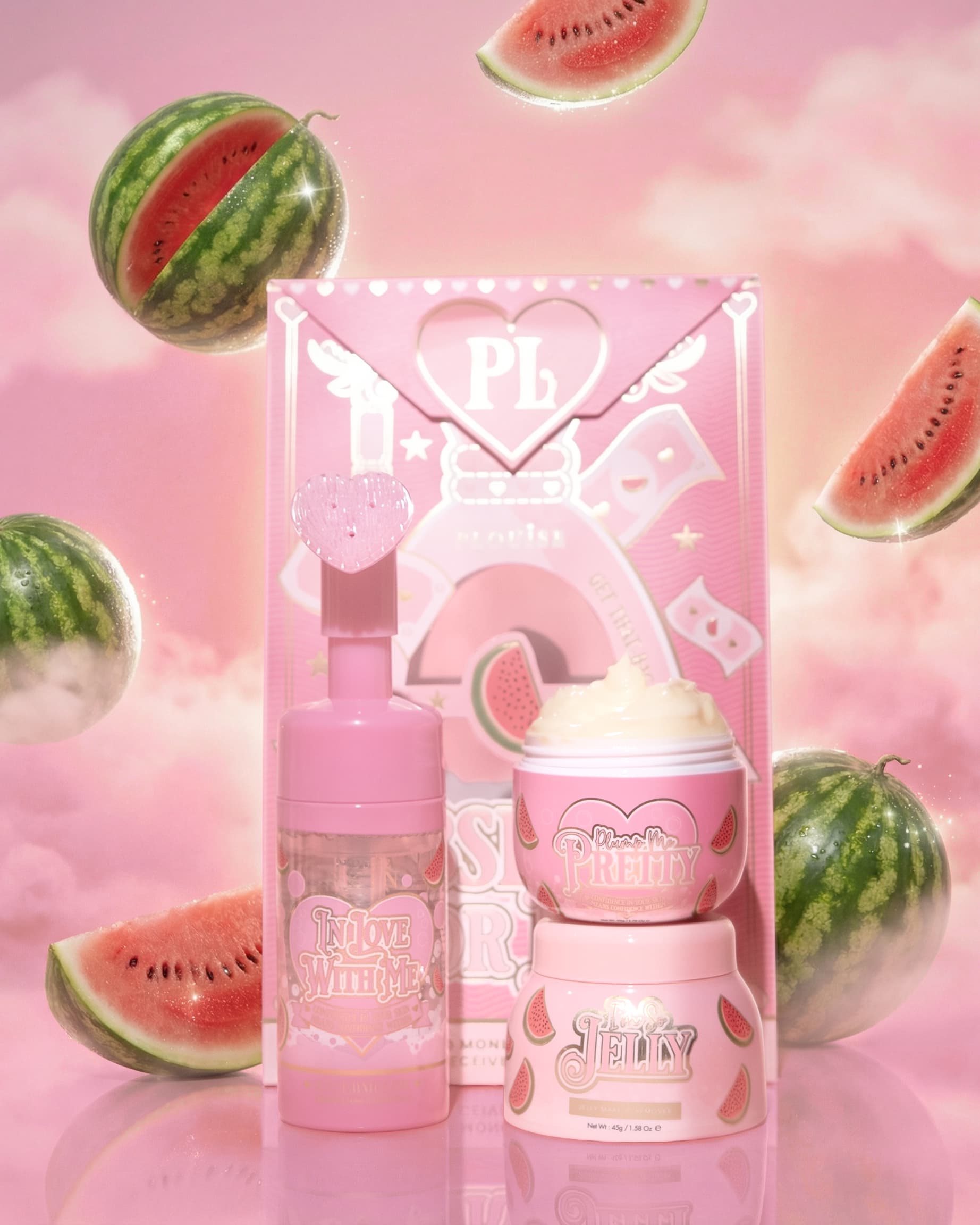 Pastèque: Je suis tellement Jelly : Aqua, palmitate d'éthylhexyle, butylène glycol, PEG-8, glycérine, huile de graines d'Helianthus Annuus (tournesol), triglycéride caprylique/caprique, copolymère PEG-240/Hdi, éther BIS-décyltétradéceth-20, poloxamère 184, polysorbate 60, stéarate de sorbitane, stéarate de PEG-100, stéarate de glycéryle, hydroxyacétophénone, benzoate de sodium, parfum, phénoxyéthanol, carbomère, aminométhyl propanol, tocophérol, laurate de potassium, extrait de Fomes Officinalis (champignon), extrait de racine de Sophora Flavescens, extrait de racine de Scutellaria Baicalensis, extrait d'écorce de Salix Alba (saule), 1,2-hexanediol, extrait de racine de Glycyrrhiza Inflata, extrait de Viola Tricolor, Gelée royale, CI 16255